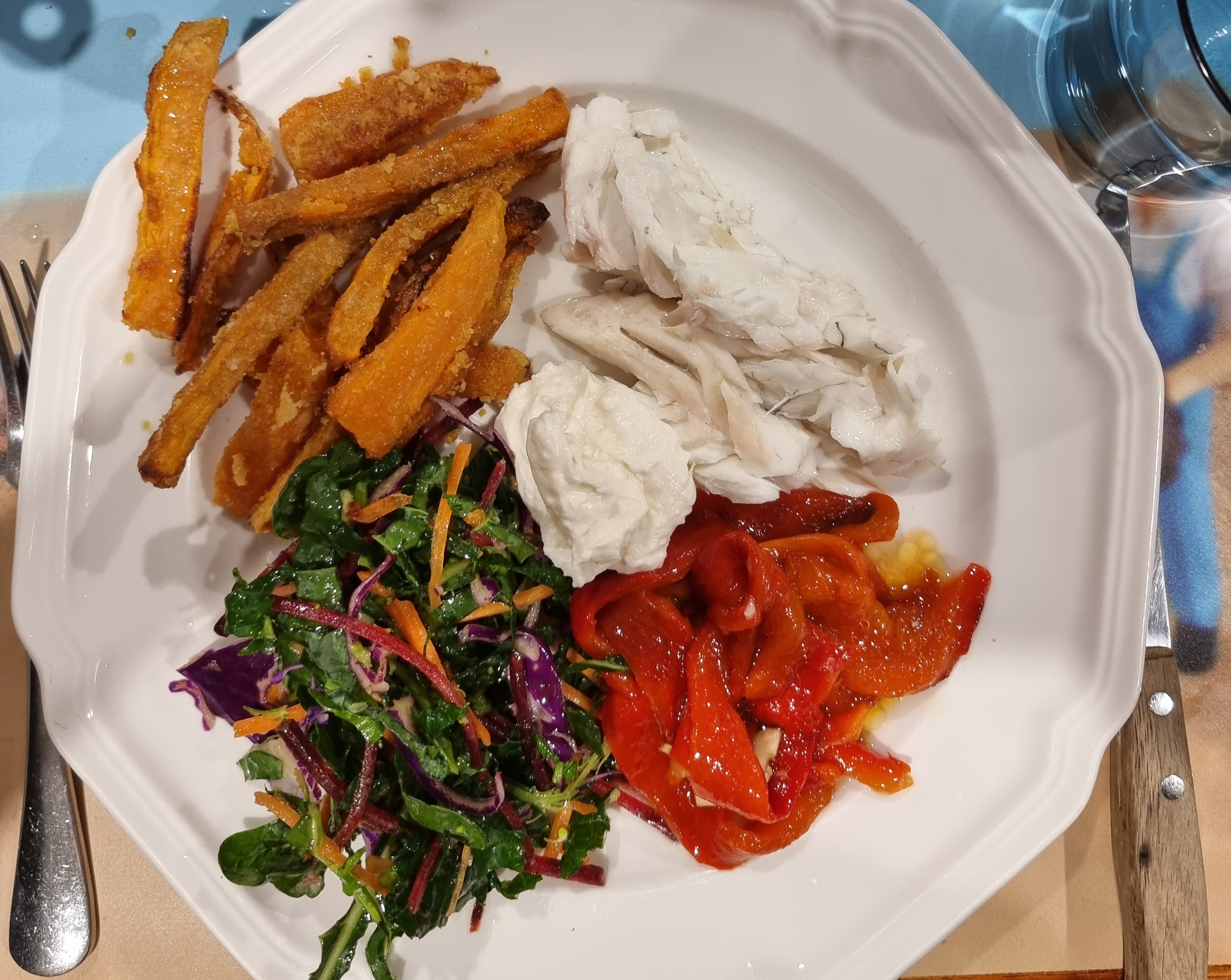 Today we ate snapper baked in sea salt, infused with lemon and orange peel with roasted sweet potato fries, a kale salad, some baked potato ‘fries’, (for the kids not me). cherry tomatoes and grilled red peppers. The kale salad was rejected outright but everything else was gobbled up! I loved the kale salad!